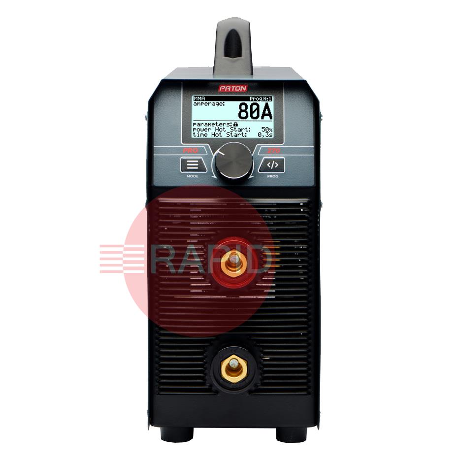 The PATON PRO-270 is a compact 270A arc welder, ideal for professional and industrial welding works. This inverter welder is also capable of TIG Lift and MIG/MAG welding after the purchase of a wire feeder. The PATON PRO-270 welder has a work stabilisation system installed, allowing it to be powered by a generator. The 270A output enables the use of electrodes from 1.6mm to 6.0mm in diameter and semi-automatic welding with solid wire from 0.6mm to 1.2mm in diameter (MIG/MAG welding is possible after purchasing a wire feeder). The PRO-270 features a 70% duty cycle and a 3-year warranty.