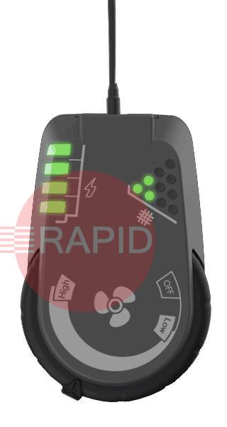 This ready to weld package includes the e684 helmet, the Swiss Air respiratory protection system complete with control panel with comfort half mask: consisting of half mask and hose system. Also included is a head and neck strap, blower unit, 14-hour battery, battery charger (UK, EU, US and AUS adaptors), shoulder harness and storage bag.