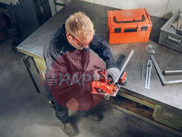 • Housing and safety hood made from die-cast aluminium and swarf collecting vessel made from material with low flammability for maximum protection from hot metal chips with sharp edges. Thanks to the LED working lamp, the user has an unobstructed view of the cutting line at all times