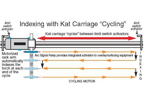 The Gullco KAT® Indexing System is typically used to automate single or multi-head overlay/cladding welding operations, hard surfacing, etc. The automatic routine drives a motorised device (either the KAT® carriage or the motorised rack arm), cycling back and forth between limit switches. When the device that is cycling reaches a limit switch, it pauses, and the other motorised device starts to index the gun/torch a pre-set distance in a pre-set direction. An Arc Signal Relay is supplied with the system to provide integrated arc activation signals to the overlay/surfacing equipment. Two GSP controls, each with dedicated microprocessor chips, are used to control the automatic, two-axis indexing system. One GSP control is the Cycle Control and the other is the Index Control. Each control offers user-programmable parameters/variables to allow fine-tuning and functional control of the automatic cycle. Gullco Indexing Systems, enable repetitive overlay/ surfacing cycles to be performed, with a precise motion of the gun/torch from start to finish, regardless of the number of passes of the workpieces involved.