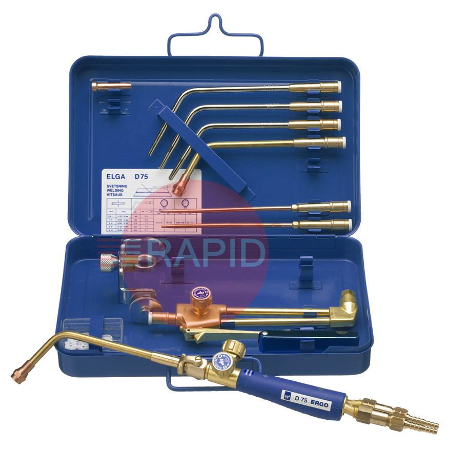 The D75 ERGO is very well suited to jobs in car workshops, farming, heating and plumbing, etc. Welding up to 10mm and cutting up to 100mm. The complete system consist of components for welding, cutting, heating and soldering.